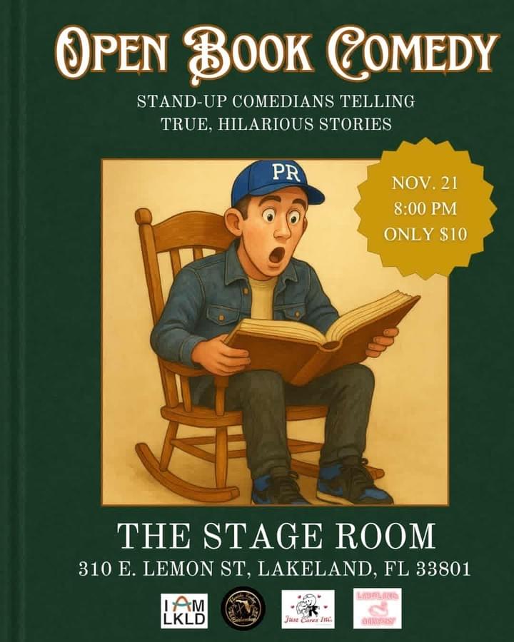 November 21, 2025. Laugh for a good cause! A night of true, hilarious stories told by an incredible lineup of stand-up comedians. Open Book Comedy features: LJ Brock, Eugene Torres, Jan Anthony, Joe Murray, Shereen Kassam, Isaiah Burns, Ginger Kelly, and Natasha Samreny. Your $10 ticket supports Just Cares, Inc. November, 21 at 8 pm.